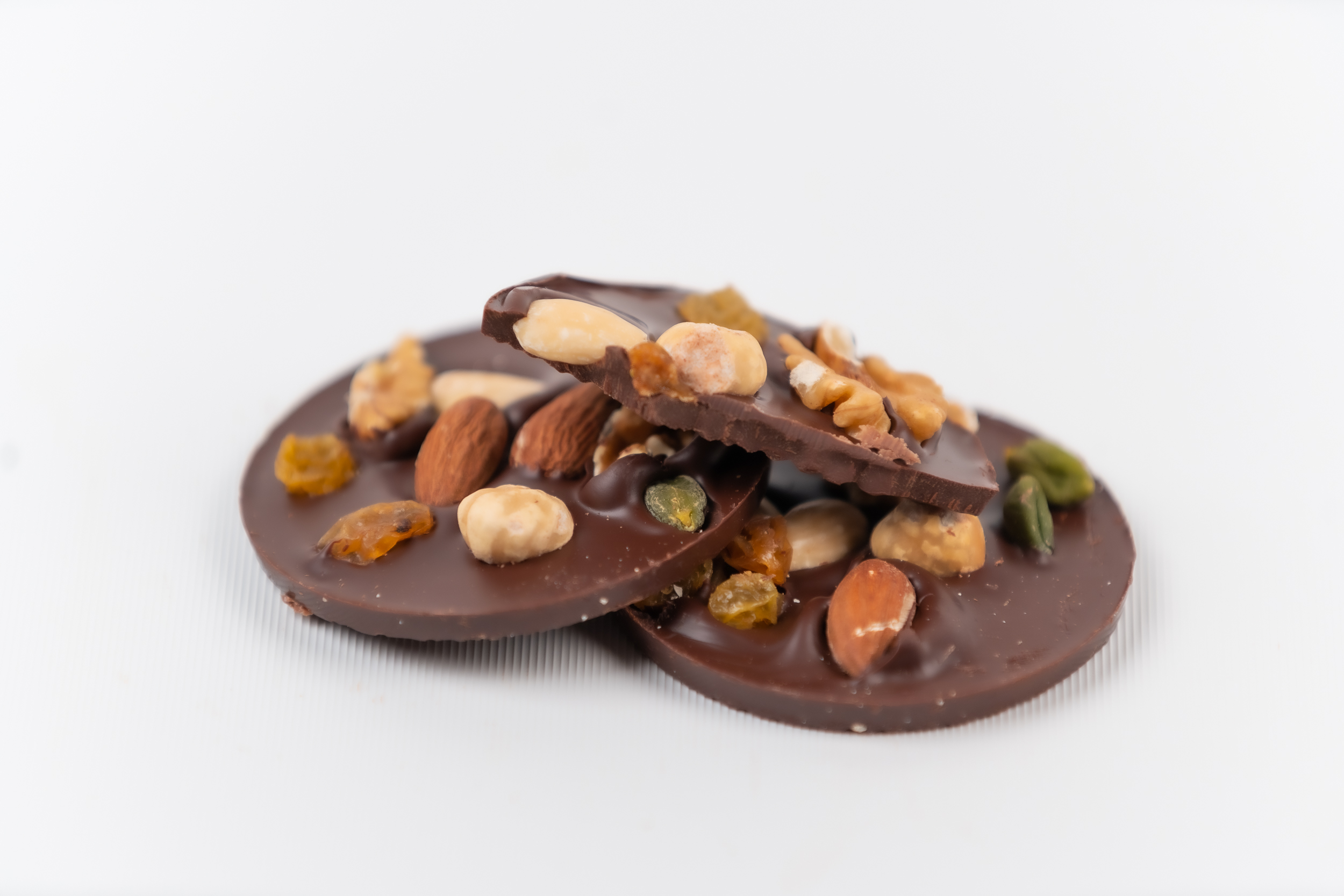 Palets de chocolat noir 64% de cacao agrémentés de fruits secs (amandes, noisettes, noix, pistaches et raisins secs)
