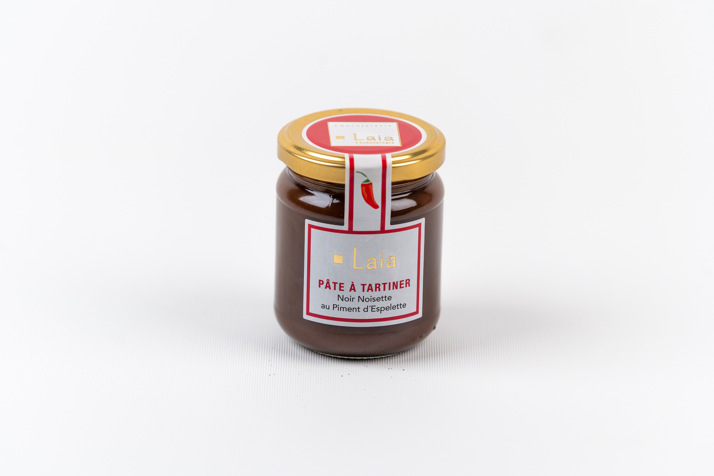 Pâte à tartiner artisanale, composée de 45% de noisettes, sans aucune matière grasse végétale et agrémentée de piment d’Espelette.
